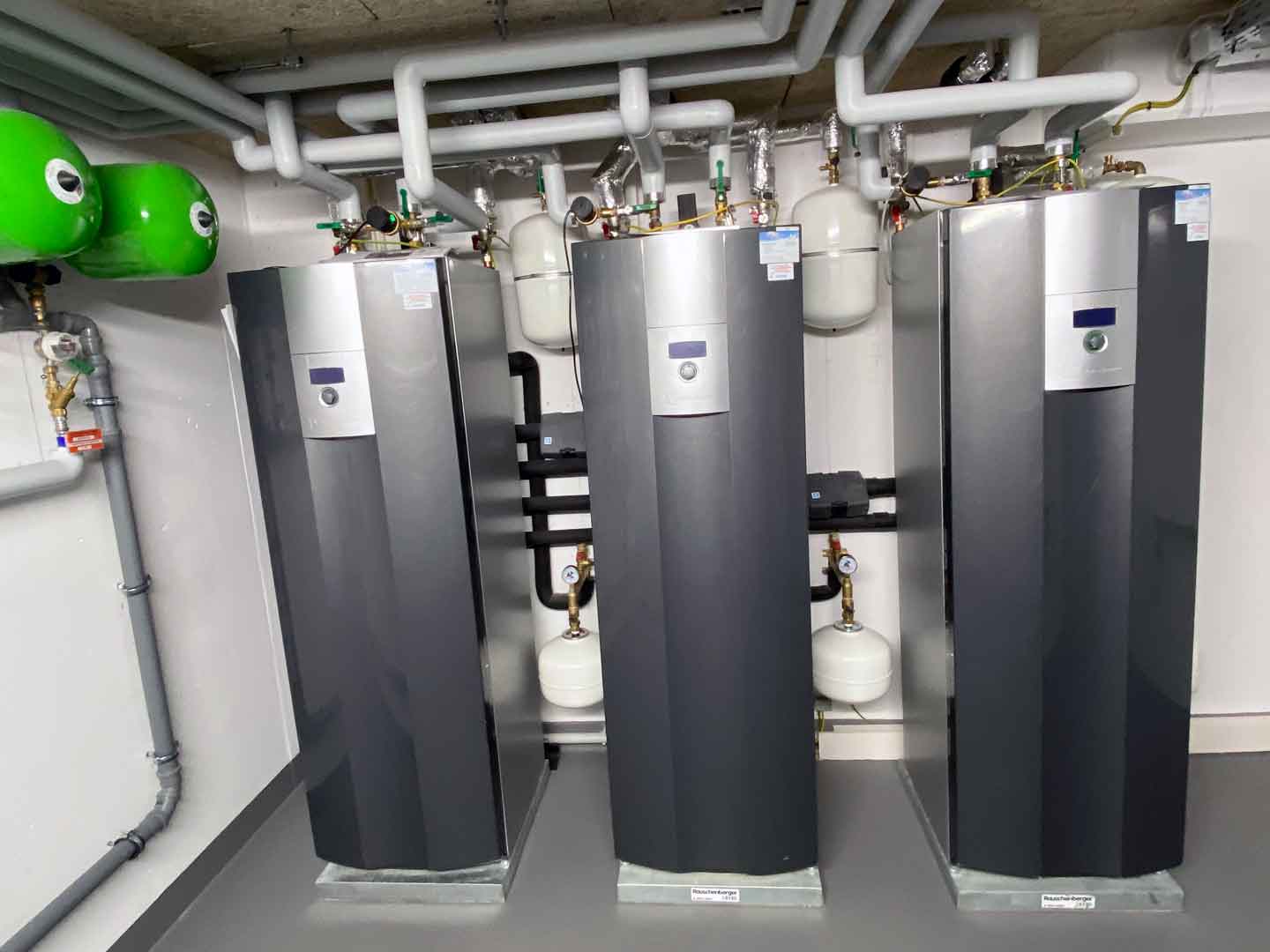 Jede der 3 Wohnungen wird mit 3 unabhängigen Sole-Wasser-Wärmepumpen betrieben. Alle drei Wärmepumpen verfügen über eine Kühlfunktion. So werden die Wohnungen im Winter gemütlich warm. Und im Sommer können die Räume auf angenehme Temperaturen herunter gekühlt werden.