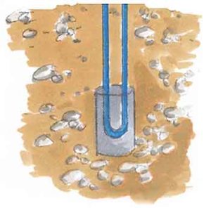 Die Erdsonde wird vertikal ca. 30 bis 100 Meter tief in das Erdreich gebohrt. Die Bohrungen erfolgen z. B. durch Schneckenbohrgeräte oder Imlochhammer.