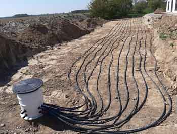 Im Garten wird während Ihrer Bauphase ein Erdwärmekollektor horizontal verlegt. Dieser nimmt die Energie aus dem Erdreich über die im Kollektor-Rohr befindliche Flüssigkeit (Sole) auf und leitet diese an die Wärmepumpe weiter.